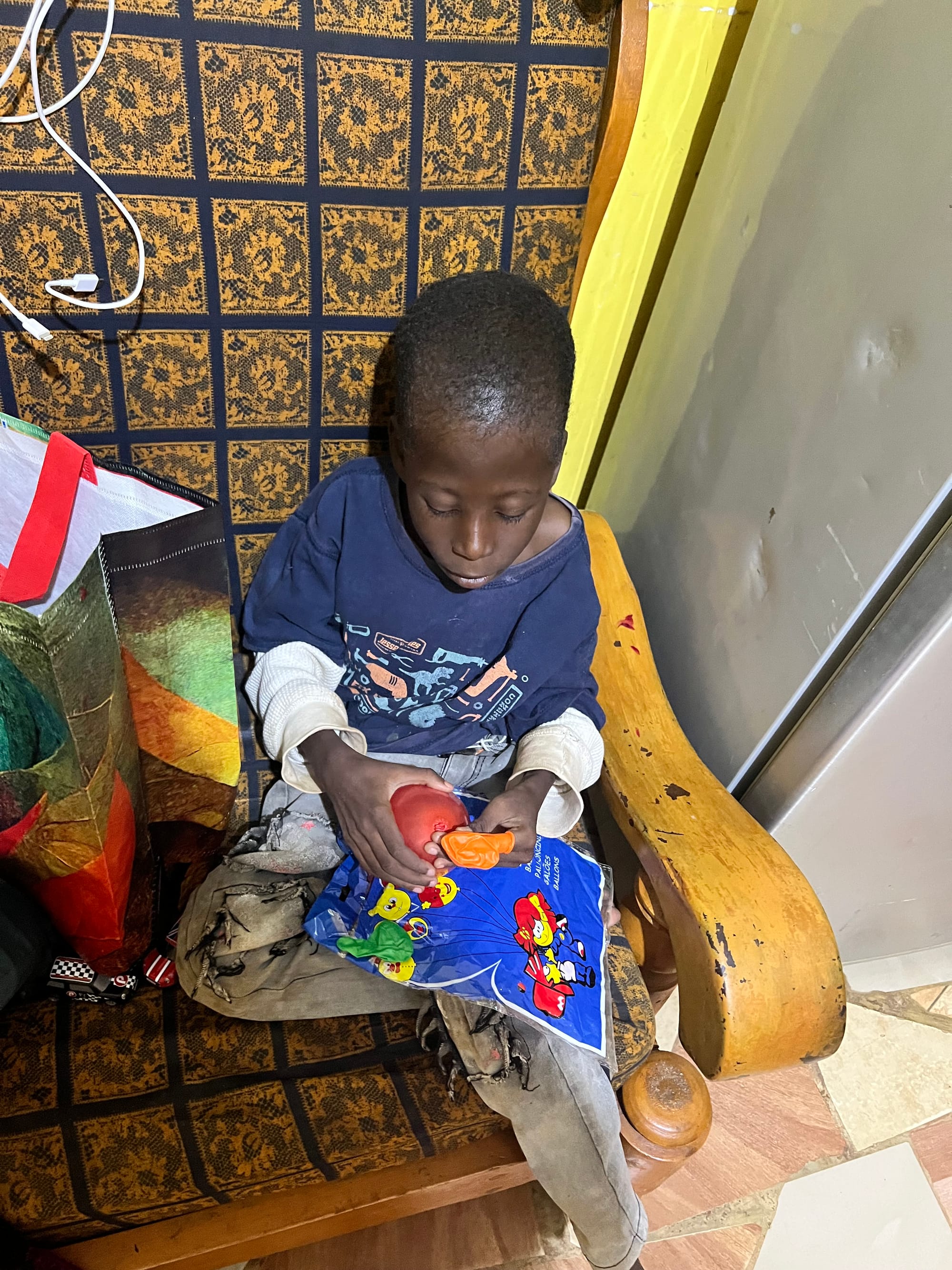 Beim Packen sitzt ein kleiner Freund neben meinem Rucksack auf dem Sofa. Seine krumme Wirbelsäule und die gelähmten Beine machen den 10 jährigen grade mal halb so groß wie meine Tasche. Er spielt mit den Luftballons und den Autos, die einen kleinen Teil der Spende ausmachten und macht sich laut lachend an die Arbeit des Luftballonplatzens und wir haben großen Spaß.