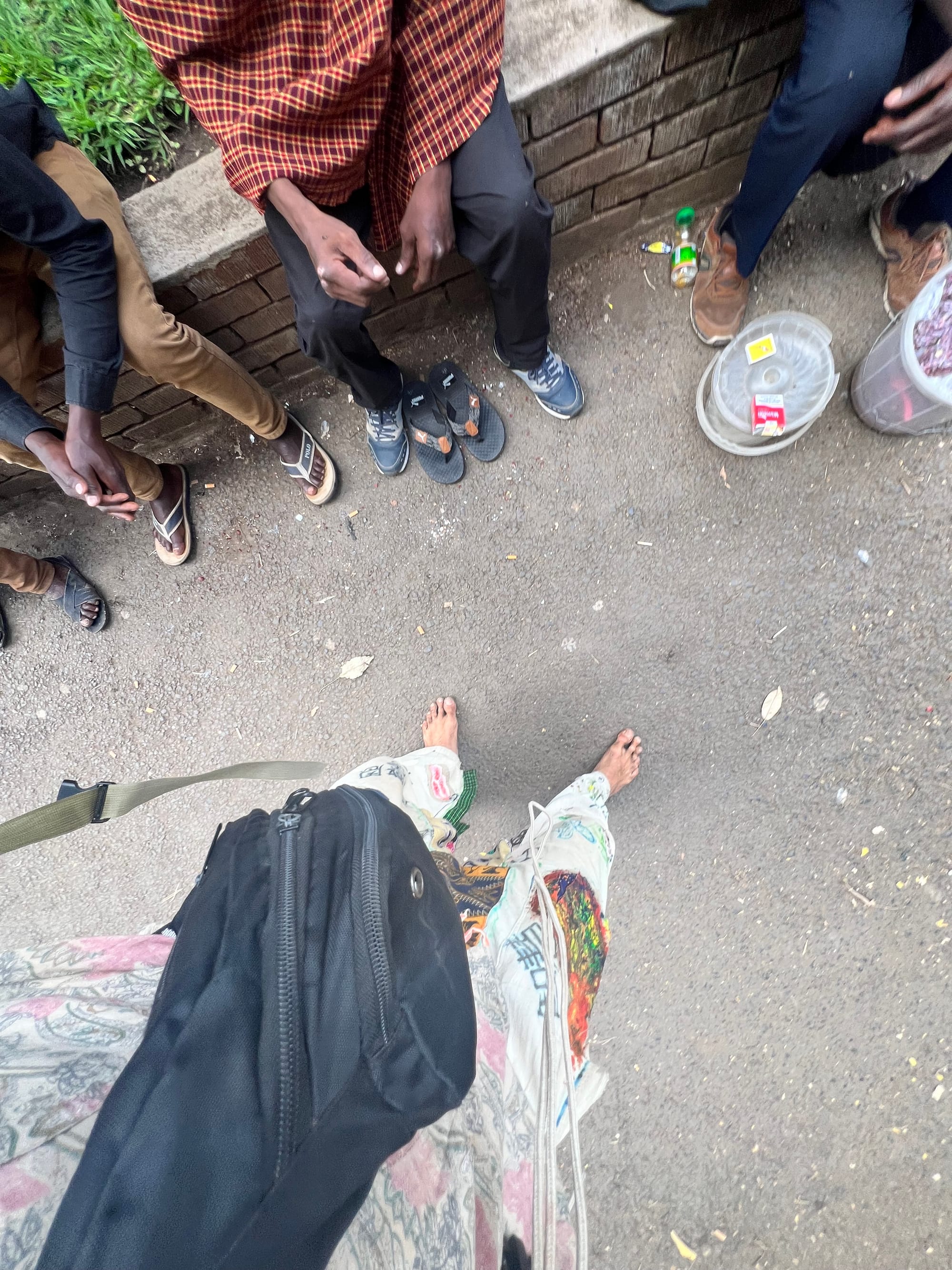 Hier treffe ich die alte Dame mit dem Plastikbottich voller Bananen auf dem Kopf. Sie versucht mir etwas zu verkaufen und ich entschuldige mich herzlich kein Geld zu haben. Etwas passiert in ihren dunklen Augen, was ich nicht ganz in Worte fassen kann und sie antwortet mir in der Sprache, die ich so halb verstehe, dass ich mir bitte eine Banane nehmen soll. Meine Entschuldigung mutiert in eine Lobpreisung und ich nehme die goldene geschwungene Frucht dankend an. Das erste Essen des Tages und es ist wirklich herrlich. Ab jetzt wird alles leichter und geht schneller. Mein Ort für die Nacht ist noch unbekannt, aber nicht mehr als zwei Kilometer entfernt. Ab hier haben die wenigsten Menschen häufiger Kontakt zu Weißen. Irgendetwas sagt mir relativ klar, dass ich etwas tue was noch nie zuvor gesehen wurde. Auf der Straße würde niemand von den Einheimischen jemals freiwillig barfuß rumlaufen und meine Rucksackgröße muss Kopfschmerzen beim zuschauen machen. Und dann wird der tag sozial…
