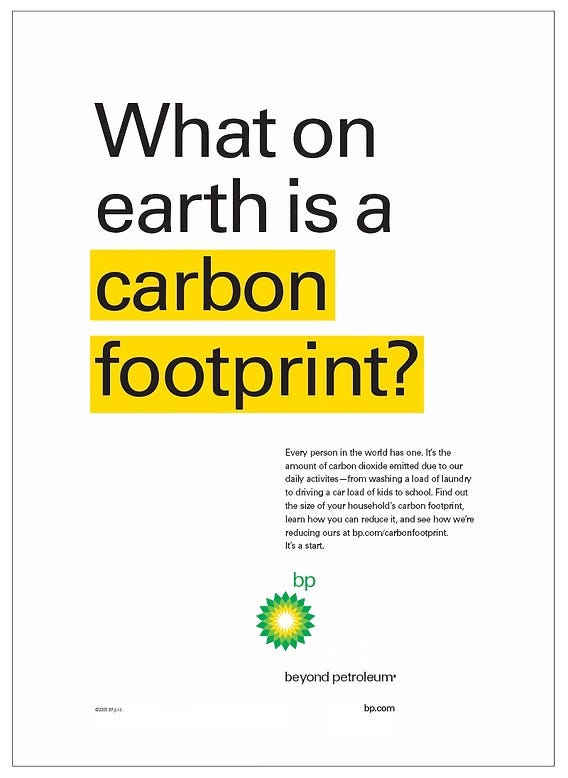 Erst 2 Jahre nachdem ich die Schule verlassen hatte, hörte ich von einem wichtigen Detail, dass im Englisch-Unterricht vergessen wurde: Der CO₂-Fußabdruck wurde nicht von WWF oder anderen Naturschutzorganisationen entwickelt, sondern war Teil einer riesigen Marketing-Kampagne von BP, auch bekannt unter British Petroleum, dem Riesen der Erdölindustrie.
