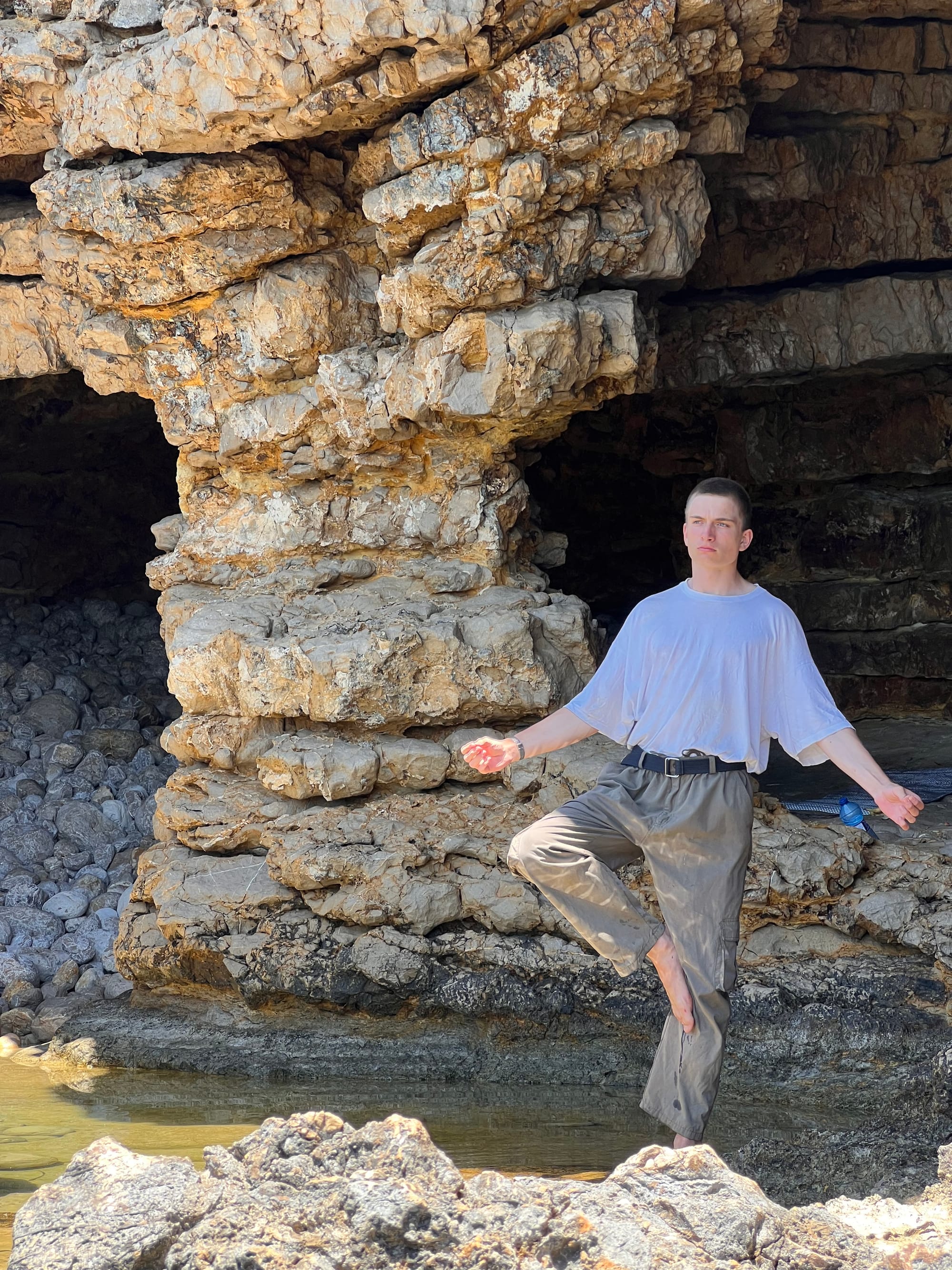 Dann verzogen wir uns in die märchenhafte Höhle und genossen den Hall unserer Stimmen, bis uns die Stimmen in unserem Kopf genügten und wir Stille walten ließen. Wir ruhten und aßen und später meditierten wir auch noch, indem wir in dem knietiefen Wasser im vorderen Teil des Höhleneingangs saßen und unsere Handflächen gestreckt und sehr leicht ebenmäßig auf die Wasseroberfläche legten und dabei im Schneidersitz zur Ruhe kamen.